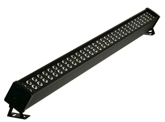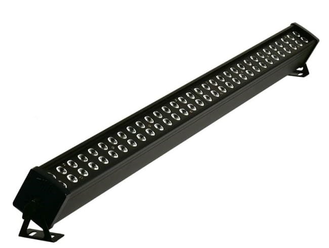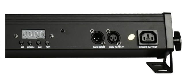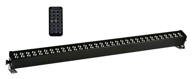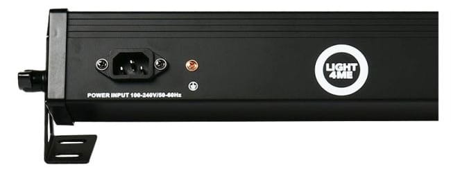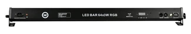 Komponenty oświetlacza LED zamknięte zostały w podłużnej obudowie. Na obu jej końcach znajdują się otwory umożliwiające zamontowanie podstaw, dzięki którym belka może pracować w pozycji stojącej lub wiszącej. Uchwyty pozwalają również ustawić listwę LED pod odpowiednim kątem w stosunku do oświetlanej powierzchni. W górnej części led bara zainstalowane są 64 diody rozmieszczone w dwóch rzędach. Na jednym z boków mieszczą się gniazda zasilania (w tym tzw. „podaj dalej” umożliwiające podawanie napięcia bezpośrednio z urządzenia do urządzenia), 3-pinowe wejście i wyjście XLR dla sygnałów DMX oraz panel sterowania w postaci czterech przycisków i cyfrowego wyświetlacza LED. Za ich pomocą możemy ustawić kolor statyczny, którym wall washer będzie oświetlał interesującą nas powierzchnię, lub wybrać jeden z czterech trybów pracy urządzenia: