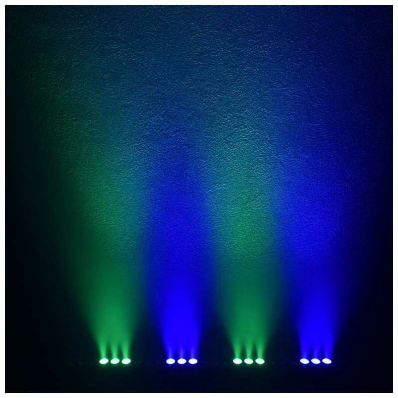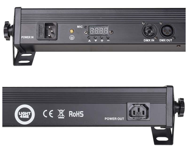 Listwa LED Light4Me Deco Bar wyposażona została w 24 mocne, 3-watowe diody (po 3 w 8 sekcjach), operujące światłem w palecie barw RGB. Na tylnym panelu znajdują się gniazda zasilania (w tym tzw. „podaj dalej” umożliwiające przekazywanie napięcia bezpośrednio z urządzenia do urządzenia), wejście i wyjście DMX oraz panel sterowania z cyfrowym wyświetlaczem i czterema przyciskami. Za ich pomocą możemy zmieniać ustawienia w menu, a także wybrać jeden z czterech interesujących nas trybów pracy: