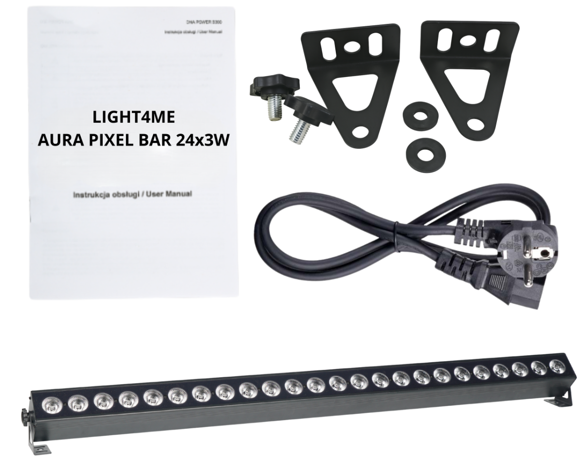 - Typ urządzenia: listwa oświetleniowa DMX LED z efektem aura i uchwytami montażowymi