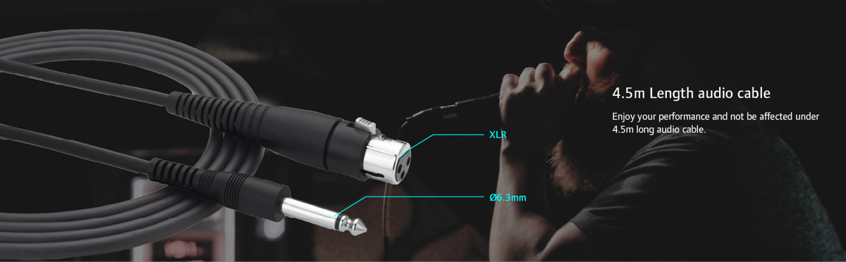 - Kabel XLR do kabla 6,3 mm: Wyposażony w przewód o długości 4,5 m zapewniający duży zasięg ruchu. Koniec z odwracaniem uwagi od ograniczonej długości przewodu. Kompatybilny z maszyną do karaoke, wzmacniaczem, mikserem, systemem PA i głośnikiem. Umożliwia bezpośrednie wykorzystanie mikrofonu karaoke do głośnika, wzmacniacza lub miksera. Doskonała konstrukcja kabla mikrofonowego może izolować zewnętrzne zakłócenia elektromagnetyczne i zapewniać wyraźną transmisję dźwięku.