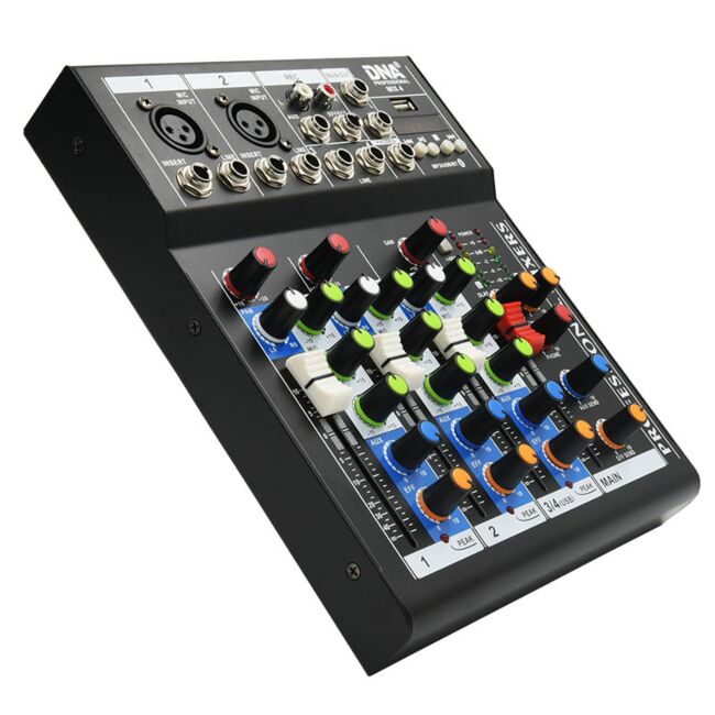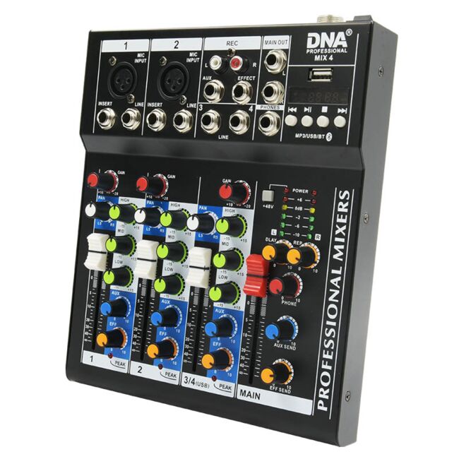 DNA MIX 4 to niewielki, podręczny analogowy mikser audio, wyposażony w port USB, obsługę plików MP3, Bluetooth oraz zasilanie Phantom. Urządzenie obsługuje 4 kanały. Dwa pierwsze posiadają wejścia sygnałowe typu XLR przeznaczone głównie dla mikrofonów, oraz dwa gniazda wejściowe jack, do których można podłączyć instrumenty (Line) albo efekty i procesory dźwięku (Insert). Kanały 3 i 4 są torem stereo posiadającym wejścia jack oraz RCA (cinch). DNA MIX 4 to idealne rozwiązanie dla wszystkich, którzy szukają małego miksera dźwięku na scenę, salę prób, do profesjonalnego lub domowego studia, dla wokalu, zespołu, DJ-a, lub po prostu chcą zwiększyć liczbę dostępnych kanałów w mikserze dźwięku, którym już dysponują.