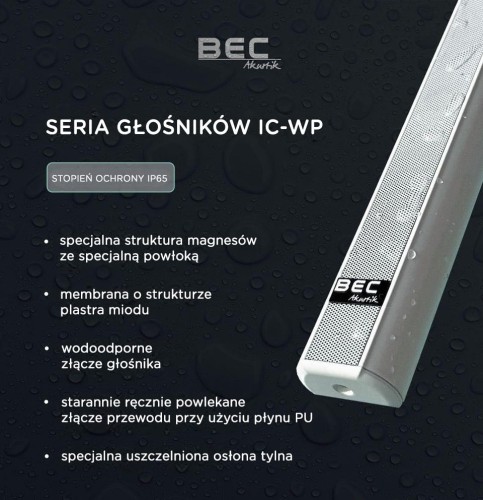 BEC Akustik IC 100WP to wodoodporna wersja modelu IC100, zaprojektowana do nagłaśniania dużych przestrzeni zewnętrznych w najwyższej jakości dźwięku. Wyposażona w trzy szerokopasmowe przetworniki 20 × 120 mm w konstrukcji line-array, oferuje pełne, dynamiczne brzmienie w zakresie od 120 Hz do 20 kHz. Korekcja fazy oraz charakterystyka kierunkowa 160° w poziomie i 40° w pionie zapewniają szerokie i równomierne pokrycie dźwiękiem, ograniczając przy tym niepożądane odbicia.