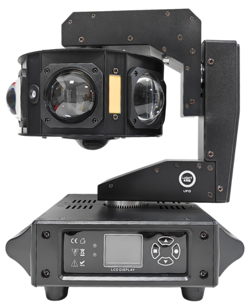Light4Me Ufo jest niezwykle prosty w obsłudze dzięki intuicyjnemu panelowi sterowania, składającego się z czytelnego wyświetlacza LED i 4 poręcznych przycisków ✔️. Urządzeniem można sterować ręcznie, a oprócz tego użytkownicy mogą wybierać spośród 4 trybów pracy: auto, sound, master/slave oraz DMX, co docenią zwłaszcza mobilni DJ i organizatorzy eventów ✨. Dzięki złączom danych DMX można połączyć wiele urządzeń i łatwo zarządzać ich pracą z pomocą protokołu DMX. Z tyłu głowicy znajdują się gniazda zasilania powercon, w tym tzw. „podaj dalej” umożliwiające podawanie napięcia bezpośrednio z urządzenia do urządzenia. Pełnozakresowy dimmer pozwala precyzyjnie dostosować jasność poszczególnych efektów świetlnych❗Regulowana prędkość stroboskopu, pełnozakresowa rotacja 0-360°, barwy statyczne i makra efektu ring, efekty kombinacji kolorów umożliwiają dodatkowe wzbogacenie oprawy oświetleniowej i dodanie jej dynamiki ✅.
