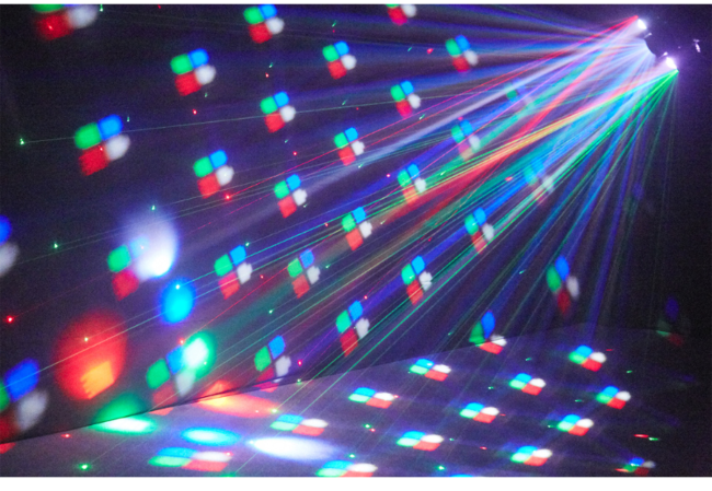 | Źródło światła | efekt beam: 2x3W R LED, 2x3W G LED, 2x3W B LED, 2x3W W LED laser czerwony: 50 mW laser zielony: 50 mW efekt Magic Ball: 15W RGBW LED 4w1 efekt ring: 12x0,2W RGB LED 3w1 |