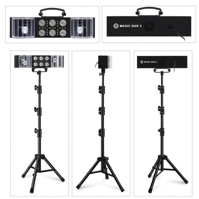 Urządzenie wyposażono w różne tryby pracy: możesz uruchomić tryb auto, dostosować pracę multiefektu do rytmu muzyki za pomocą trybu sound z regulowaną czułością mikrofonu lub wybrać inne funkcje za pomocą pilota na podczerwień ✅. Regulowany statyw (56-165 cm) pozwala na dopasowanie wysokości efektu do warunków panujących na imprezie ✔️. Statyw po złożeniu ma tylko 51 cm, więc transport oraz przechowywanie multiefektu świetlnego i jego statywu nie sprawią żadnych problemów ✅. Light4Me Magic Bar 3 to idealny wybór na dyskoteki, urodziny, wesela, a także domowe spotkania w gronie znajomych! ✨