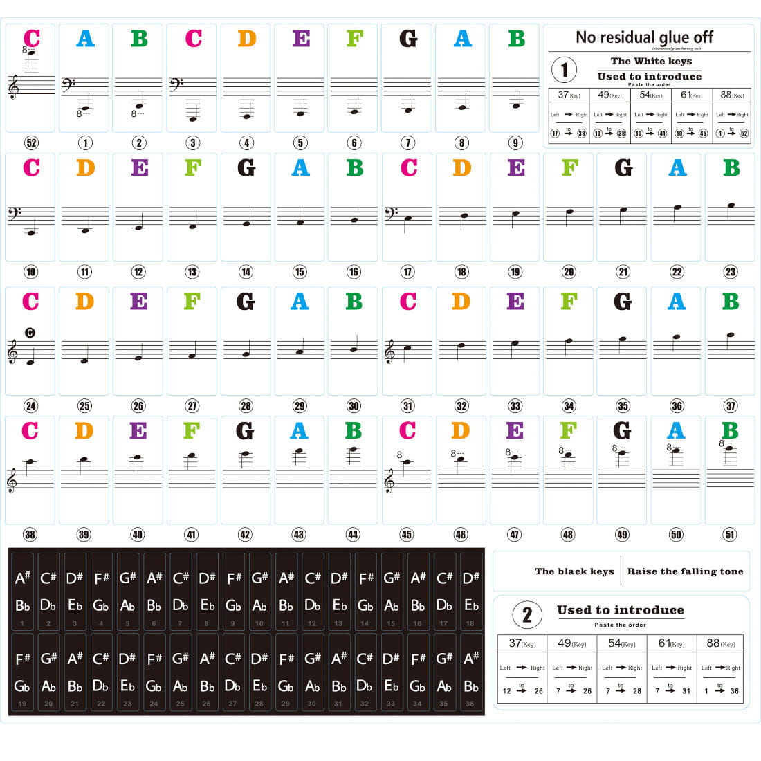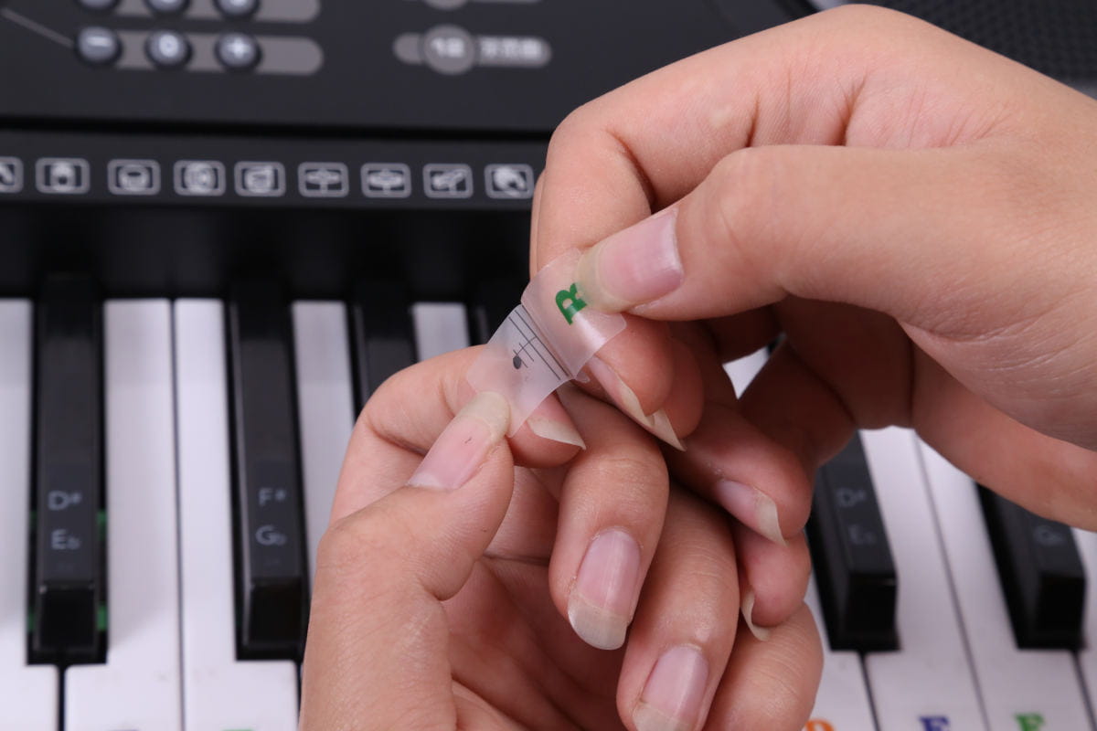 Wykonane są z wysokiej jakości przezroczystego, wytrzymałego materiału PVC. Ich zadaniem jest ułatwianie nauki w zapamiętywaniu nut, jednocześnie bawiąc. Kolorowe naklejki wykonane są z przyjaznego dla środowiska tworzywa i mogą być używane wielokrotnie. Nie zostawiają śladów kleju i nie niszczą klawiszy fortepianu czy pianina. Pomimo ich przezroczystej konstrukcji są wytrzymałe i zachowują swoją niezmienioną postać przez wiele miesięcy. Sprawiają, że nauka gry jest łatwiejsza i przyspieszają zapamiętywanie klawiszy. Można nauczyć się grać na pianinie szybciej i mieć z tego jednocześnie dużo zabawy.