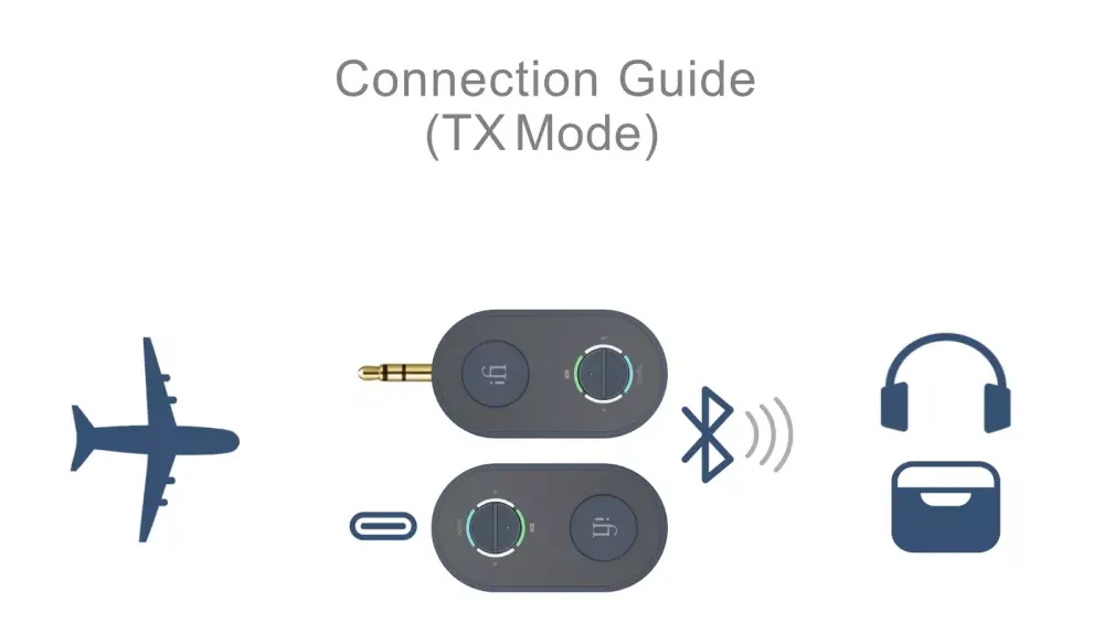 - Łączy bezprzewodowe słuchawki z systemem rozrywki pokładowej w samolocie (tryb TX)