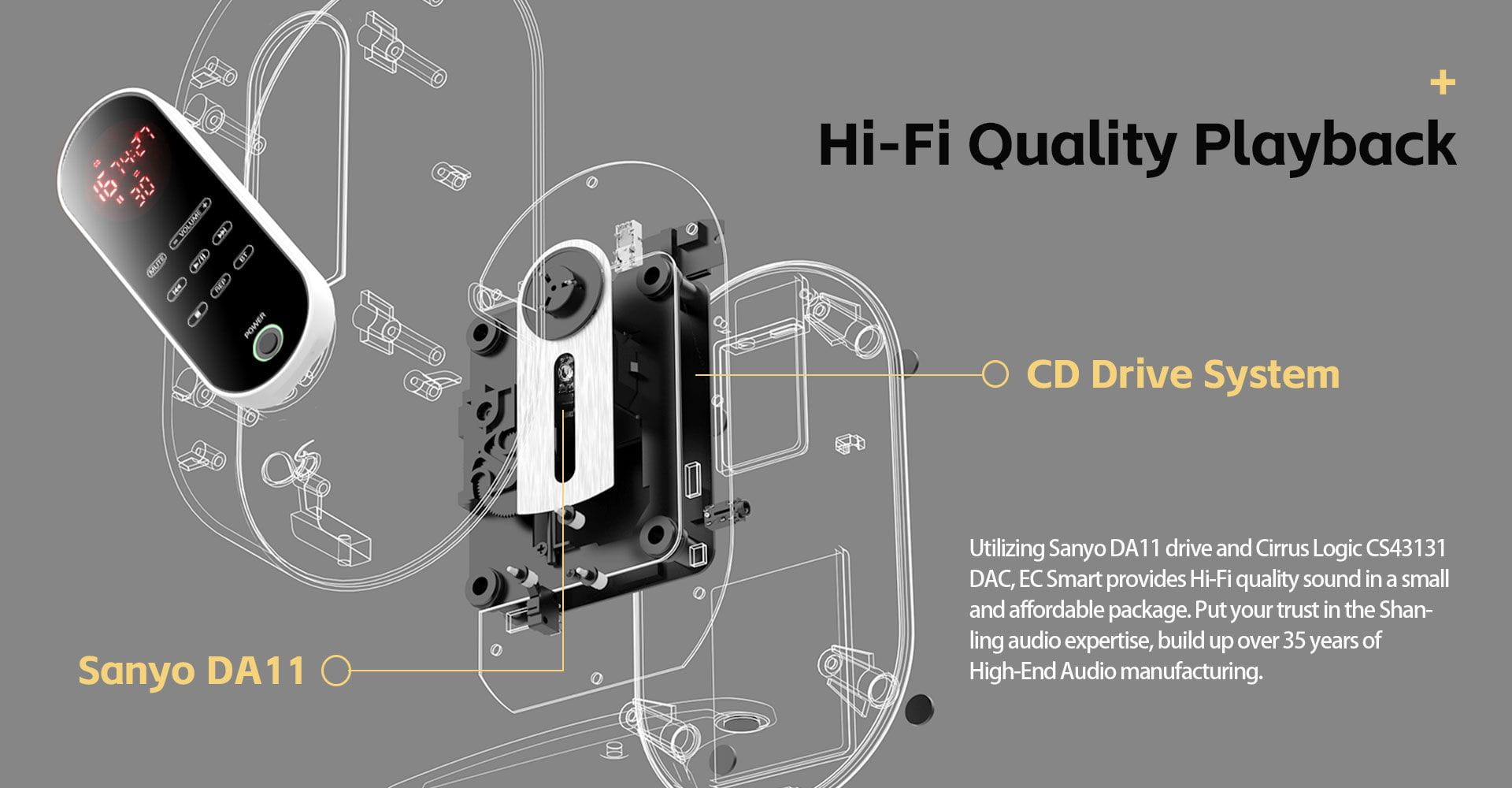 Shanling EC Smart to kompaktowy i niedrogi odtwarzacz, ale został on oparty na wysokiej klasy podzespołach, co gwarantuje świetną jakość dźwięku. Model ma ceniony napęd Sanyo DA11, układ DAC CS43131, czyli flagowe rozwiązanie firmy Cirrus Logic, czy wydajny wzmacniacz SG Micro SGM8262. EC Smart strojony był do tego przez inżynierów firmy Shanling Audio o ponad 35-letnim doświadczeniu w tworzeniu sprzętu audio.