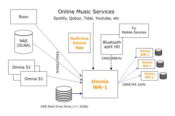 Wbudowany przetwornik DAC zapewnia obsługę plików PCM w rozdzielczości 24-bit/192kHz. Odtwarzacz NuPrime Omnia WR-1 może stać się częścią systemu multiroom. Producent zapewnia obsługę do 8 stref. NuPrime Omnia WR-1 posiada czytelny wyświetlacz OLED, który wskazuje najważniejsze informacje o odtwarzanych utworach. Obudowę wykonano z metalu, co zapewnia dużo lepszą ochronę przed zewnętrznymi falami elektromagnetycznymi oraz stabilność całego urządzenia. Całości dopełnia klasyczny pilot, który pozwala wygodnie obsłużyć WR1 i zarządzać wszystkimi sygnałami audio w systemie stereo. Ponadto sterowanie urządzeniem odbywa się za pomocą aplikacji dostępnej na urządzenia z systemem Android, a w przyszłości także iOS.