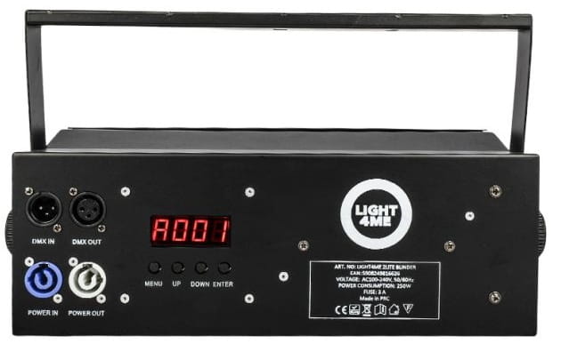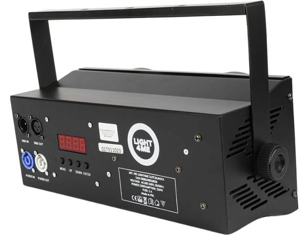 Light4Me 2Lite Blinder może być w łatwy sposób instalowany na kratownicach lub rampach oświetleniowych za pomocą uchwytu montażowego dołączonego do urządzenia. Taki montaż umożliwia uzyskanie pożądanego kąta świecenia i w efekcie oświetlanie pożądanej powierzchni. Na tylnej części blindera znajdują się gniazda zasilania typu powercon, w tym specjalne wyjście typu ✅ „podaj dalej”, umożliwiające bezpośrednie przekazywanie napięcia między urządzeniami. Dodatkowo dostępne są również 3-stykowe gniazda XLR, pozwalające na obsługę reflektora przy użyciu protokołu DMX. Panel sterowania składa się z cyfrowego wyświetlacza i czterech przycisków, gwarantując łatwą konfigurację i obsługę. Za jego pomocą możemy ✅ wybrać jeden z czterech interesujących nas trybów pracy:
