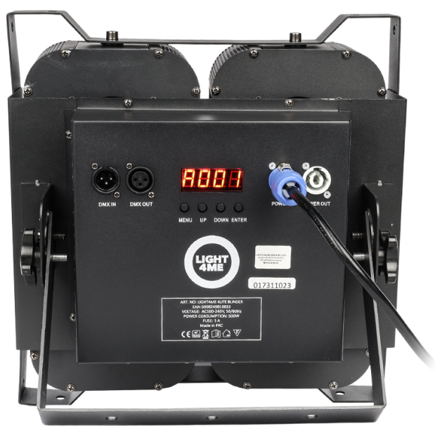 Light4Me 4Lite Blinder może stać lub być w łatwy sposób instalowany na kratownicach lub rampach oświetleniowych, a także łączony w zespoły za pomocą uchwytu montażowego dołączonego do urządzenia. Taki montaż umożliwia uzyskanie pożądanego kąta świecenia i w efekcie oświetlanie pożądanej powierzchni. Na tylnej części blindera znajdują się gniazda zasilania typu powercon, w tym specjalne wyjście typu ✅ „podaj dalej”, umożliwiające bezpośrednie przekazywanie napięcia między urządzeniami. Dodatkowo dostępne są również 3-stykowe gniazda XLR, pozwalające na obsługę reflektora przy użyciu protokołu DMX. Panel sterowania składa się z cyfrowego wyświetlacza i czterech przycisków, gwarantując łatwą konfigurację i obsługę. Za jego pomocą możemy ✅ wybrać jeden z czterech interesujących nas trybów pracy: