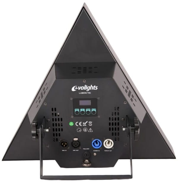 Evolights Lumen Tri posiada stylową, czarną obudowę z trókątną, efektowną kratownicą, która bardzo dobrze prezentuje się na scenie. Reflektor jest nowoczesny, a jednocześnie nawiązuje do klasycznych wzorców sprzed kilku dekad. Solidna obudowa została wyposażona w wytrzymały uchwyt montażowy umożliwiający instalację oświetlacza na statywach, kratownicach i rampach oświetleniowych. Z tyłu znajduje się wygodny panel sterowania z czytelnym wyświetlaczem OLED i 4 przyciskami dotykowymi oraz wejście/wyjście powercon, które umożliwiają przekazywanie napięcia zasilającego bezpośrednio z jednego urządzenia do drugiego ✅. Klasa IP20, stosunkowo kompaktowe wymiary i niewielka waga sprawiają, że urządzenie jest bezpieczne w użytkowaniu, a także łatwe do transportowania oraz przechowywania. Kontrola podświetlenia wyświetlacza oraz opcja wyświetlenia czasu pracy urządzenia to dodatkowe atuty, które zwiększają funkcjonalność i wygodę użytkowania.