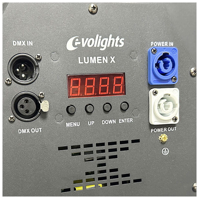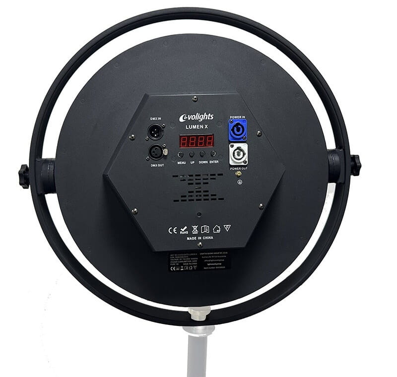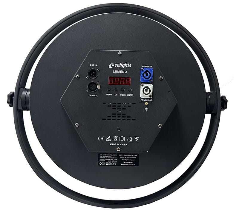 Evolights Lumen X posiada stylową obudowę z efektowną kratownicą o strukturze plastra miodu, która bardzo dobrze prezentuje się na scenie. Reflektor jest nowoczesny, a jednocześnie nawiązuje do klasycznych wzorców sprzed kilku dekad ✅. Solidna obudowa została wyposażona w uchwyt montażowy umożliwiający instalację oświetlacza na statywach, kratownicach i rampach oświetleniowych. Z tyłu znajduje się wygodny panel sterowania z czytelnym wyświetlaczem LCD, 3-stykowe wejście i wyjście XLR dla łatwej kontroli w trybie DMX oraz gniazda zasilania powercon (w tym, tzw. „podaj dalej” umożliwiające podawanie napięcia bezpośrednio z urządzenia do urządzenia).