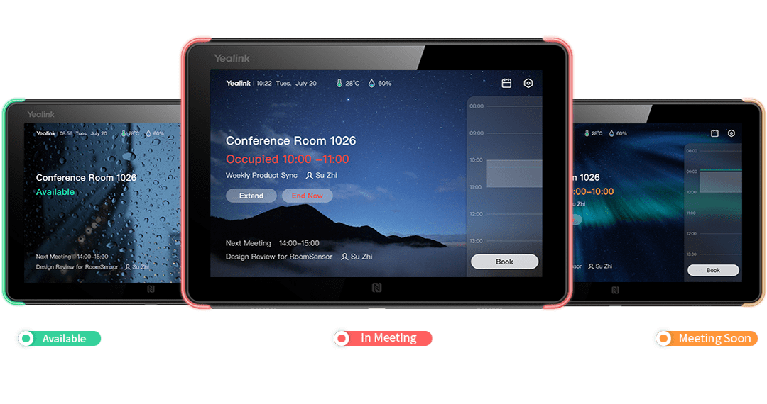 Yealink RoomPanel to 8-calowy panel konferencyjny typu all-in-one z systemem Android 10.0 i pełnym programowalnym podświetleniem LED RGB dla natychmiastowo widocznej komunikacji o stanie pomieszczenia. Posiada 10-punktową obsługę dotykową, Wi-Fi 802.11ac, Bluetooth 5.0, wbudowany czytnik NFC/RFID, ulepszone matryce mikrofonów i głośniki, aby spełnić wszystkie wymagania nowoczesnego miejsca pracy. Wyposażony również w Power-over-Ethernet i różne uchwyty montażowe, Yealink RoomPanel można łatwo zamontować na dowolnej powierzchni.
