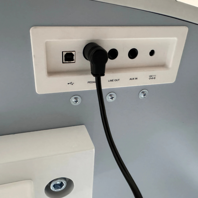 - Gniazda wejścia: USB-B, PEDALS (5-pinowe MIDI), AUX IN (jack 6,35 mm), DC 12V