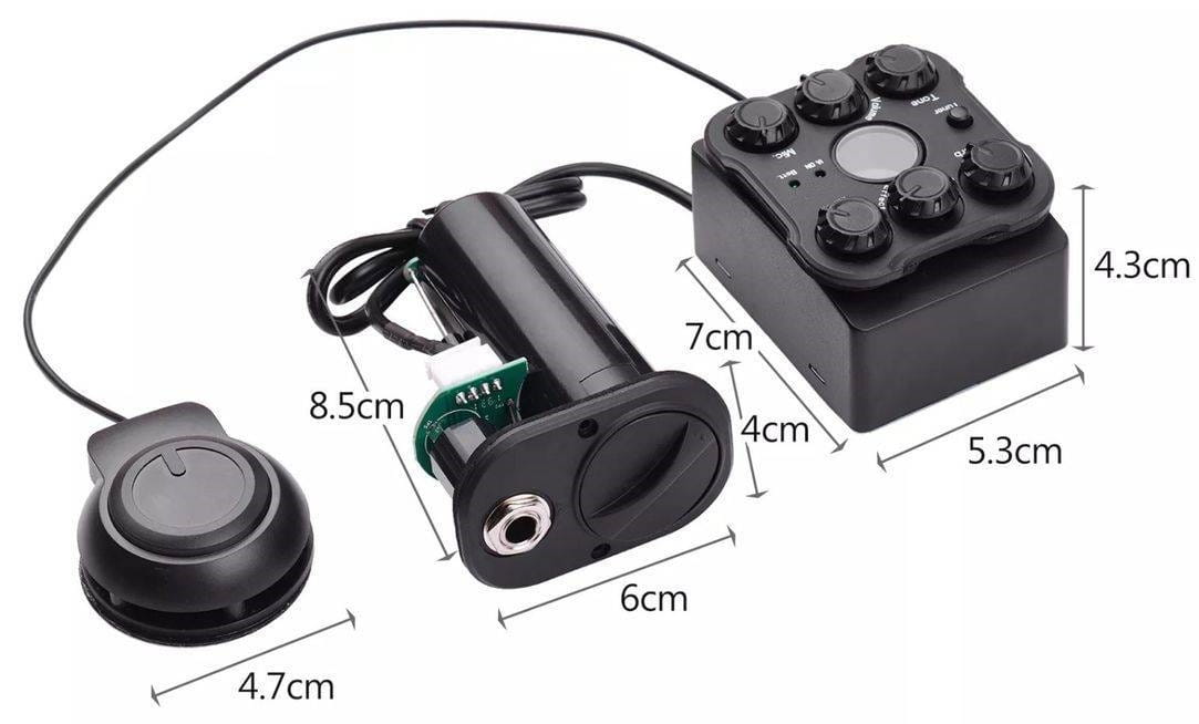 | W zestawie | 1 x Pickup 4 x Śruby montażowe Mikrofon/głośnik Gniazdo typu Jack z Pojemnikiem na akumulator Ładowarka do akumulatora 1 x Kabel |
