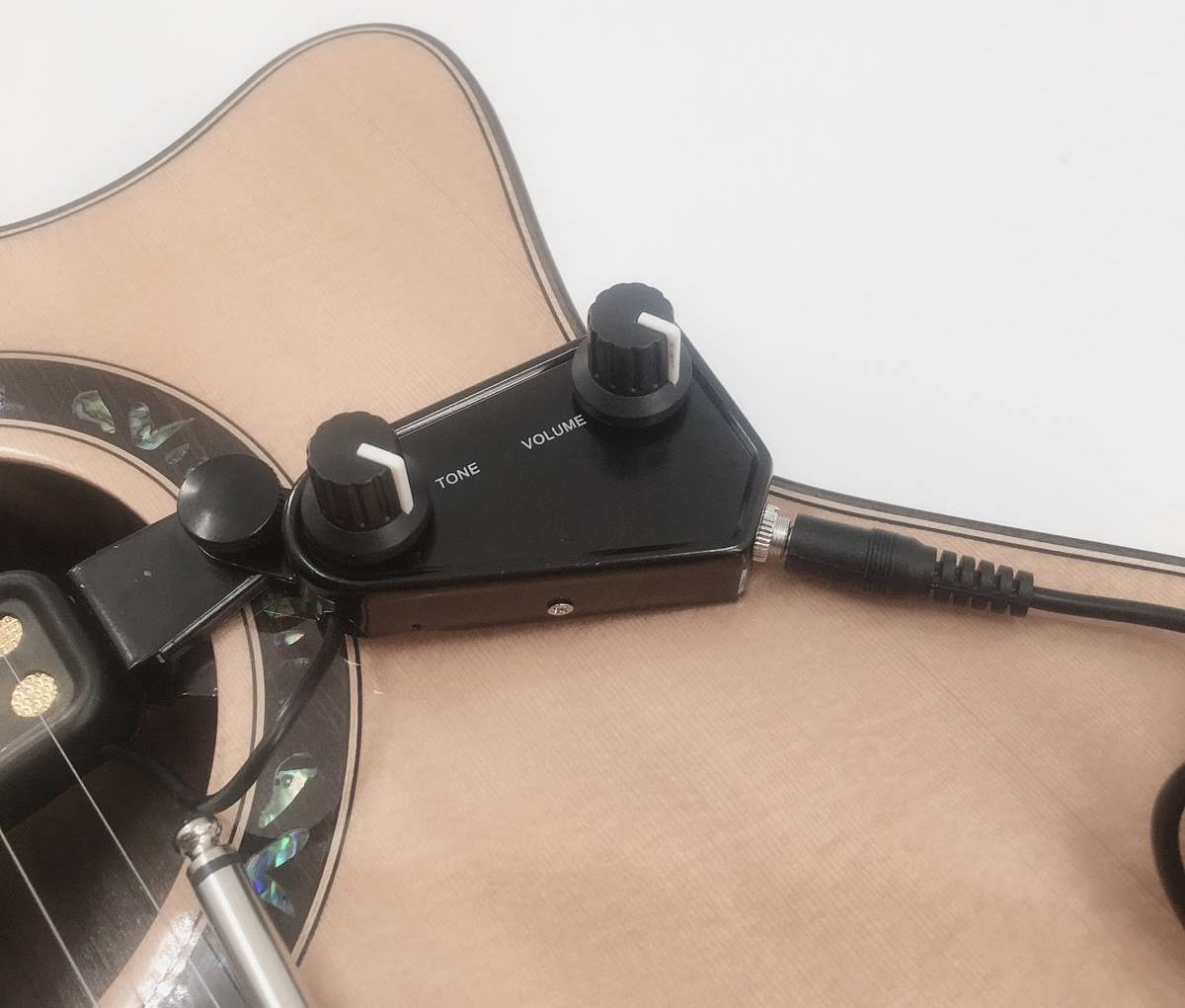 Przetwornik gitary akustycznej można przypiąć do otworu dźwiękowego gitary i podłączyć wejście audio za pomocą standardowego złącza 6,3 mm.
