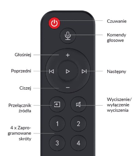 Za pomocą pilota możesz odtwarzać lub wstrzymywać odtwarzanie, przechodzić do poprzedniego lub następnego utworu, regulować głośność, wyciszać dźwięk i wybierać ulubioną zaprogramowaną piosenkę, stację radiową, podcast lub cokolwiek innego za pomocą jednego przycisku, aby rozpocząć.