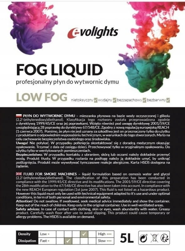 EVOLIGHTS LOW FOG – profesjonalny płyn do wytwornic ciężkiego dymu (płyn do wytwornic ciężkiej mgły) powstały na bazie oczyszczonej wody i glikolu, przeznaczony do tworzenia scenicznych efektów specjalnych.