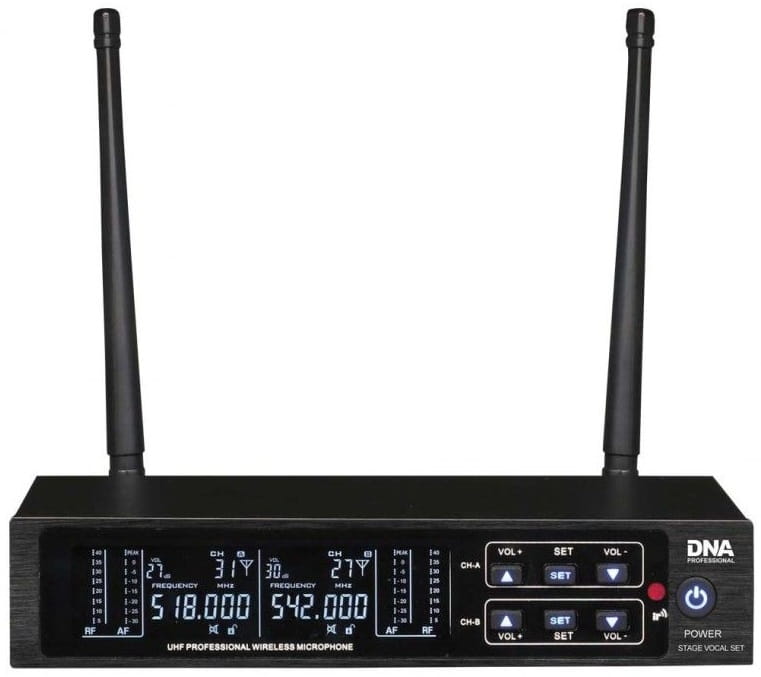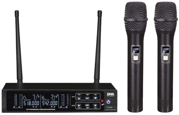 DNA STAGE VOCAL SET to wysokiej jakości bezprzewodowy system mikrofonowy oparty na technologii cyfrowej. Zestaw składa się z odbiornika fal UHF oraz dwóch mikrofonów. Idealnie sprawdza się podczas koncertów i występów na żywo, eventów, na weselach, w klubach z karaoke, a także w mobilnej pracy DJ-ów. Bezprzewodowe mikrofony wyposażone zostały w czytelny wyświetlacz LCD wskazujący częstotliwość pracy nadajnika i poziom naładowania baterii, a także odbiornik podczerwieni, dzięki któremu sygnał wychodzący może być zsynchronizowany z odbiornikiem. Urządzenia zasilają dwie baterie typu AA, które pozwalają na pracę mikrofonów nawet przez 8 godzin!