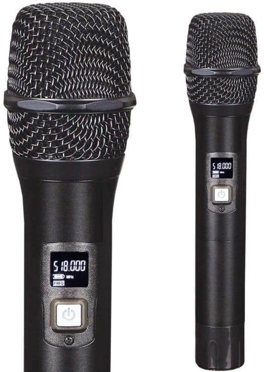 • mikrofony wyposażone zostały w czytelny wyświetlacz LCD wskazujący częstotliwość pracy nadajnika i poziom naładowania baterii