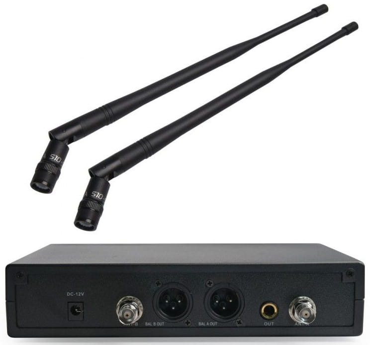 • wyjścia XLR dla kanałów A i B, wyjście typu jack (1/4”), gniazdo zasilacza oraz dwa złącza antenowe BNC