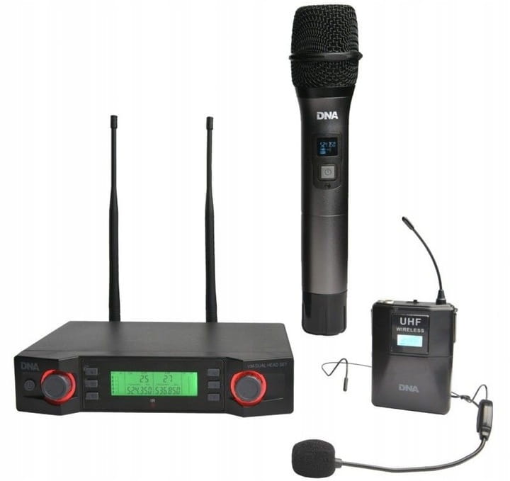 * zestaw składa się z odbiornika (UHF), bezprzewodowego mikrofonu oraz nadajnika przypaskowego (tzw. „bodypada” lub „beltpacka”) wyposażonego w mikrofon zakładany na głowę