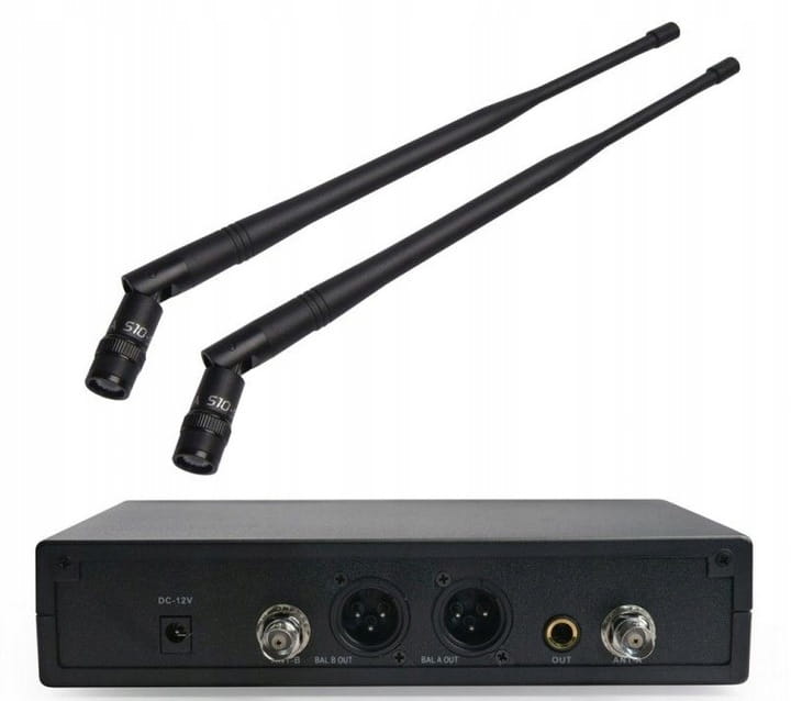 Drugą część systemu stanowi odbiornik fal radiowych o zakresie częstotliwości od 518 do 542 MHz. Na tylnej części jego obudowy znajdują się wyjścia XLR dla kanałów A i B, wyjście typu jack (1/4”), gniazdo zasilacza oraz dwa złącza antenowe BNC. W części przedniej mieści się przełącznik zasilania, dwa potencjometry głośności, odbiornik podczerwieni oraz podwójny panel sterowania z wyświetlaczem LCD. Pokazuje on aktualne parametry systemu, takie jak poziom sygnału RF/AF, ustawienie częstotliwości odbiornika, wybrany kanał pracy, a także to, czy mikrofony są aktualnie włączone, czy wyłączone. Korzystając z przycisków Up, Down i Set możemy dokonać ręcznego wyboru częstotliwości lub przeprowadzić automatyczny skan, podczas którego do urządzeń systemowych przypisana zostanie niezakłócona częstotliwość.