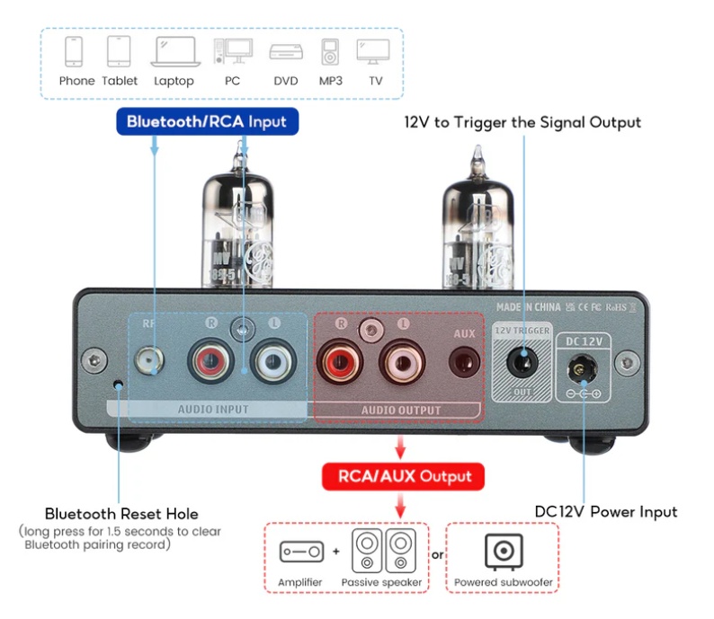 | Inne | Obsługiwane urządzenia: telefony komórkowe, tablety, komputery, MP3, telewizory itp. Ten przedwzmacniacz lampowy nie obsługuje phono., Tryb wyjściowy: 1. Głośnik aktywny 2. Wzmacniacz + głośnik pasywny, 3. Aktywny subwoofer |
