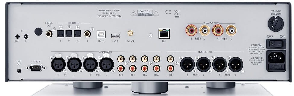 Urządzenie wyposażone zostało w 2 pary niskoszumowych wejść XLR, 4 pary wejść analogowych RCA. Poza tym PRE60 zaopatrzono w 2 pary wyjść RCA i 2 pary zbalansowanych wyjść XLR oraz wyjścia do nagrywania, RS 232, trigger oraz wejście podczerwieni. PRE60 posiada także zintegrowany DAC z odtwarzaczem strumieniowym, którego sterowanie umożliwia aplikacja Primare App na iOS oraz na Android Aplikacja umożliwia wybór i zmianę wejść, regulację głośności, przeszukiwanie zawartości zasobów on-line oraz dostęp do bibliotek muzycznych.