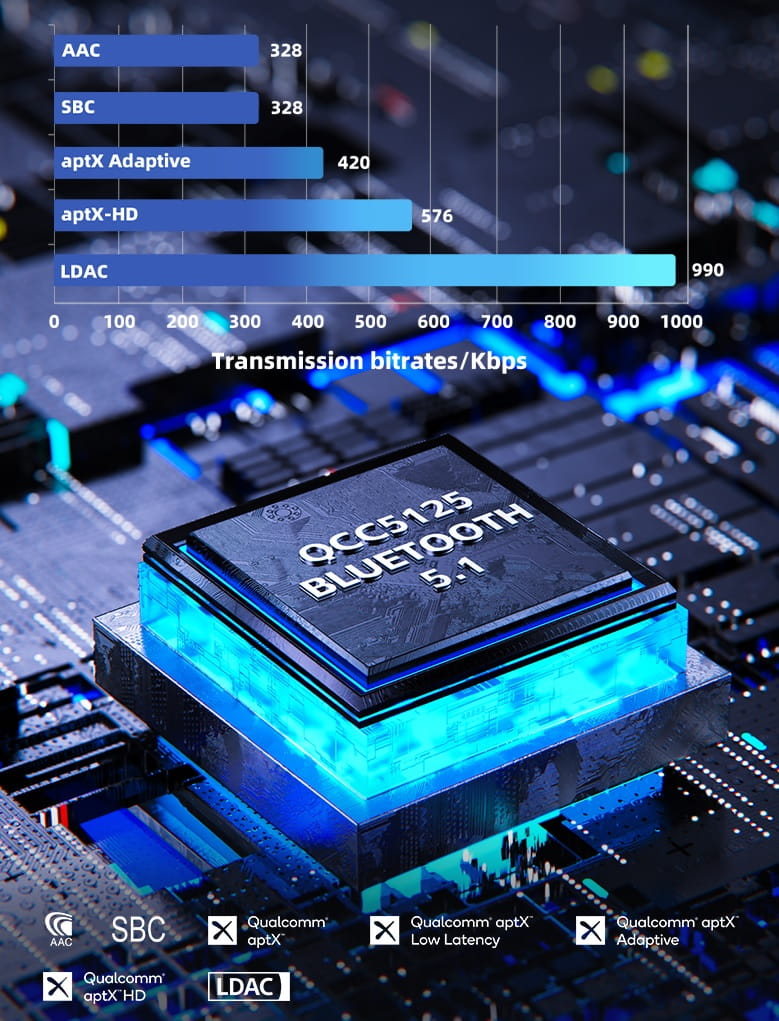 | Zastosowane układy | Układ Bluetooth: QCC5125 (architektura dwurdzeniowa CPU+DSP) |