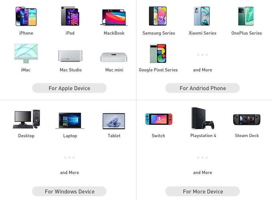 Fosi Audio DS1 to niezwykle uniwersalny DAC/AMP, który współpracuje z szeregiem urządzeń. Można korzystać z niego w parze ze smartfonami i tabletami z systemami Android i iOS (wymaga dokupienia przewodu na Lightning do urządzeń Apple), komputerów na platformach Windows i macOS czy nawet konsol, jak PlayStation 4 czy Nintendo Switch.