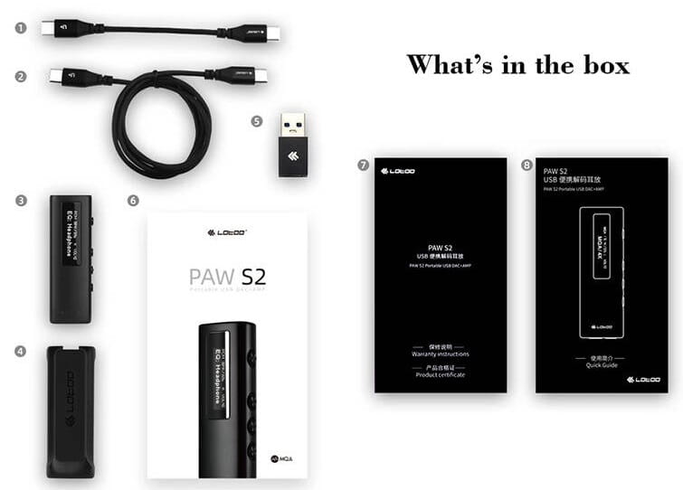 Zespół Lotoo dla PAW S2 przygotował specjalny klips, który umożliwia przymocowanie DAC/AMP-a do koszuli, koszulki czy paska plecaka/torby. Jest on wykonany z odpornego tworzywa i ma specjalnie zaprojektowane uchwyty, które gwarantują stabilne spoczywanie urządzenia. Firma zadbała dodatkowo o specjalną konstrukcję, która umożliwia zawinięcie przewodu we wnętrzu klipsa. W zestawie z PAW S2 można znaleźć nie tylko klips, ale również dwa kable OTG (6,5 cm i 80 cm) z wtykami USB-C oraz adapter z USB-C na USB-A. Kable z wtykami Lightning dostępne są jako opcja.