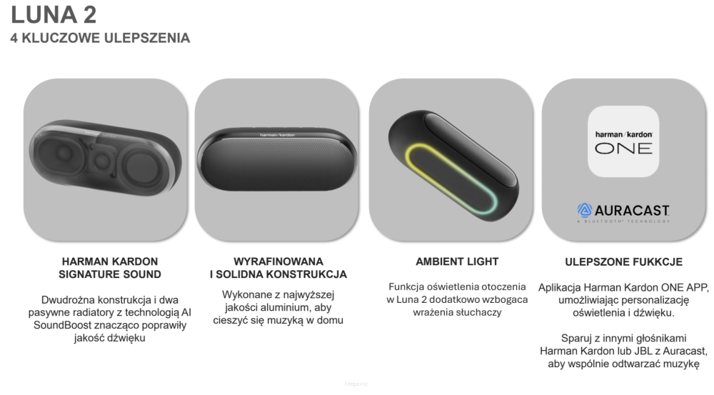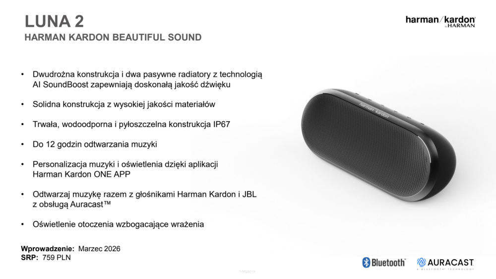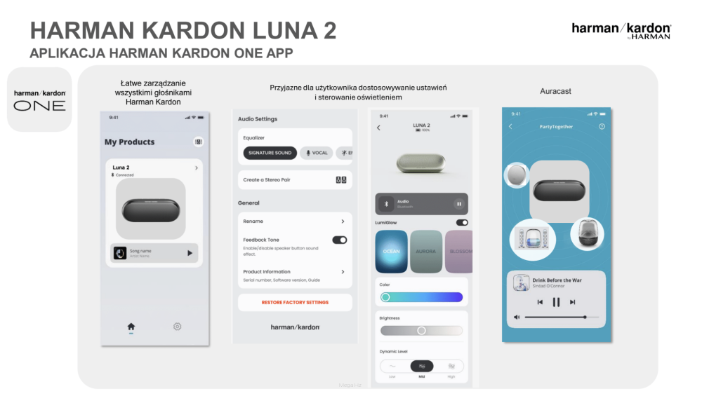 Luna 2 oferuje połączenie z wieloma głośnikami za pomocą Auracast™. Wystarczy nacisnąć przycisk Auracast na głośniku lub skorzystać z aplikacji Harman Kardon One, aby połączyć dwa lub więcej głośników Harman Kardon z obsługą Auracast™ i wypełnić przestrzeń płynnym, zsynchronizowanym dźwiękiem. Niezależnie od tego, czy chcesz stworzyć nastrój, czy urządzić imprezę, możesz bez problemu podłączyć dowolną liczbę głośników, aby cieszyć się wciągającym dźwiękiem.