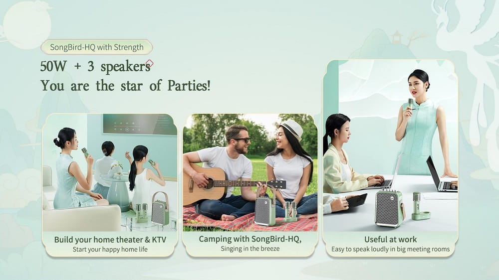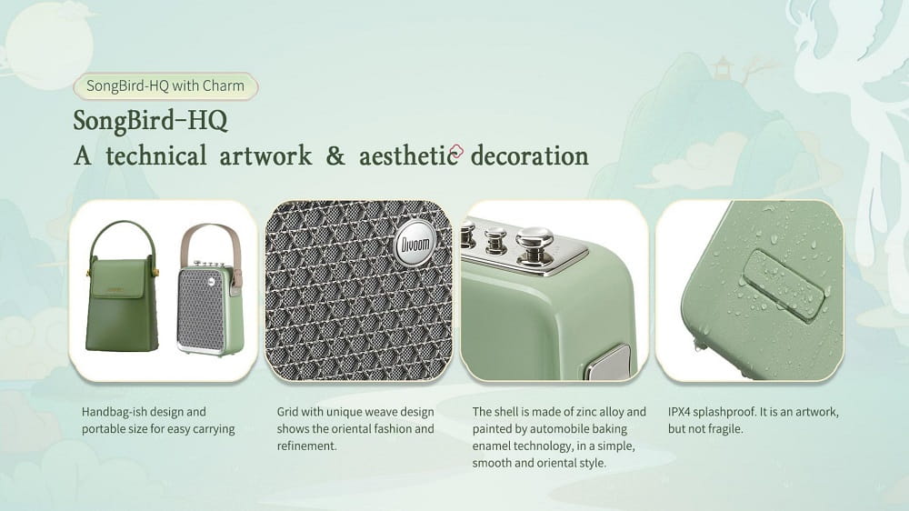 SongBird ma elegancki i nowoczesny wygląd z metalową maskownicą i gumowanym wykończeniem, które zapewnia wygodny chwyt. Jest dostępny w dwóch różnych kolorach: białym i zielonym. Głośnik jest również lekki i łatwy do przenoszenia, dzięki czemu idealnie nadaje się do zajęć na świeżym powietrzu, podróży lub po prostu do słuchania muzyki w domu.