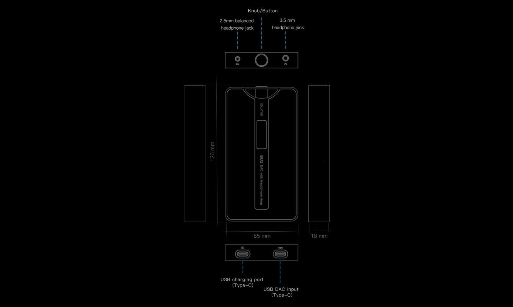 Aune BU2 - w porównaniu do poprzednika, czyli modelu BU1 - wyposażony jest nie tylko w wyjście słuchawkowe 3,5 mm (single ended), ale również wyjście zbalansowane 2,5 mm. Pierwsze z nich ma moc na wyjściu na poziomie 100 mW przy 32 Ω (1,8 Vrms), a drugie - aż 265 mW przy 32 Ω (3,6 Vrms).