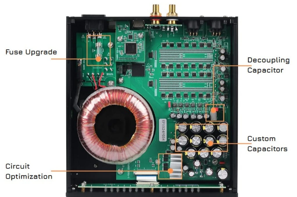 - specjalnego transformatora O-Core 60 VA z ekranem, który jest wykonany przez zespół Denafrips z miedzi o wysokiej czystości;