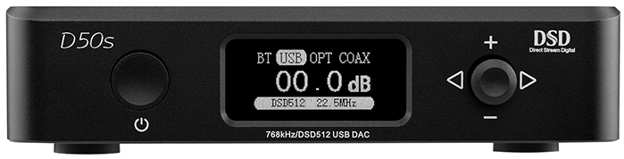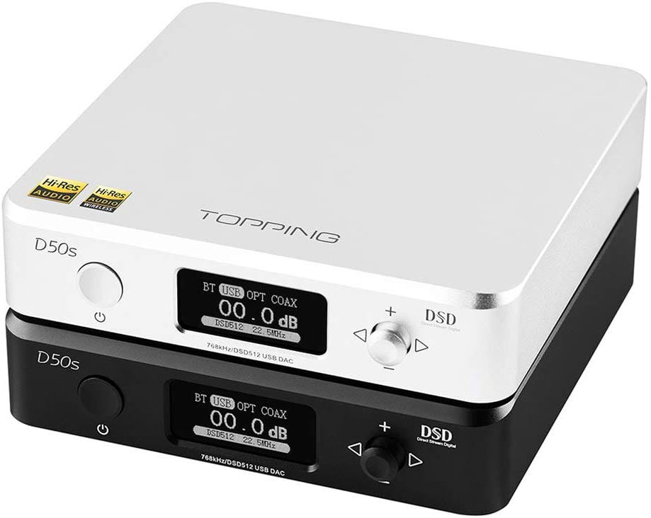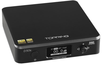 Topping D50s to wysokiej klasy DAC USB z wyjściem liniowym, optycznym i koncentrycznym, do tego jest wyposażony w wyświetlacz OLED o przekątnej 0,96 cala. Wykorzystuje XMOS (XU208), 2 x ES9038Q2M + 3 x OPA1612 i niestandardowe sterowniki zapewniające wsparcie dla DSD512 i PCM 32bit / 768 kHz.