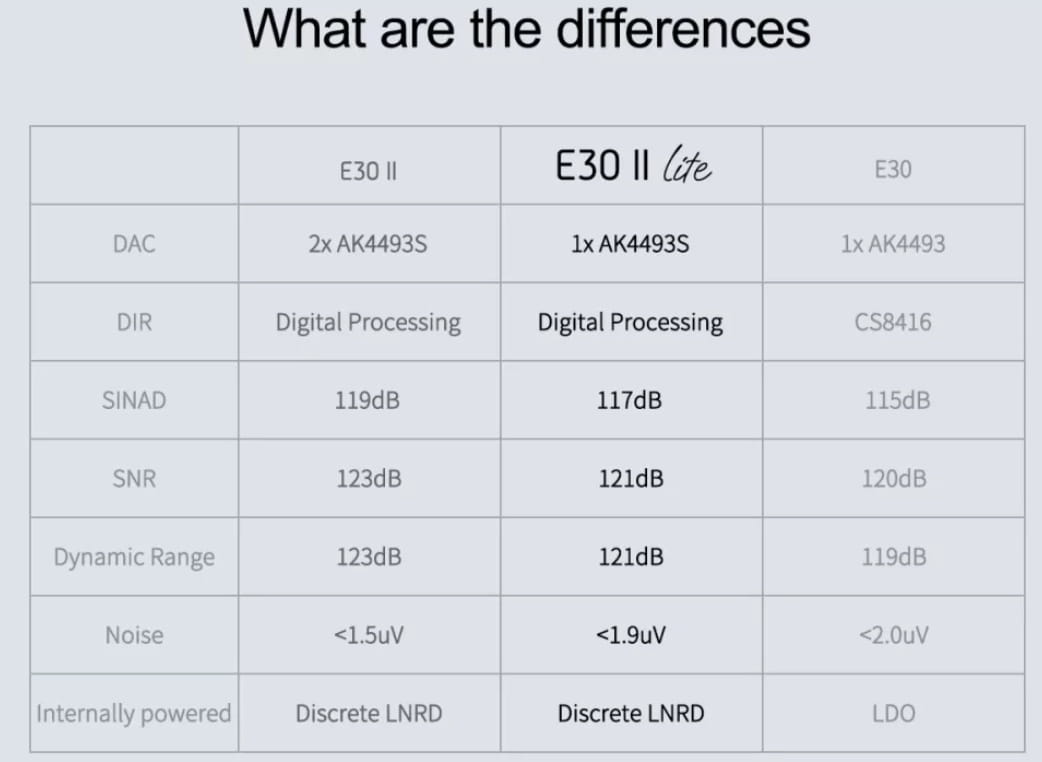 Główną zmianą w E30 II Lite jest stopień konwersji cyfrowo-analogowej. Wykorzystuje pojedynczy układ AKM AK4493S DAC. To samo w sobie jest ulepszeniem układu AK4493. Korzysta także z autorskiej technologii Velvet Sound, która zapewnia odtwarzanie dźwięku tak precyzyjne, jak bogate w szczegóły. Dzięki AK4493S E30 II Lite ma zakres dynamiczny do 121 dB i THD <0.0004%. Zapewnia to nie tylko wysoką dokładność przywracania sygnału audio, ale także zapewnia szczegółowe wrażenia muzyczne, jak na żywo.