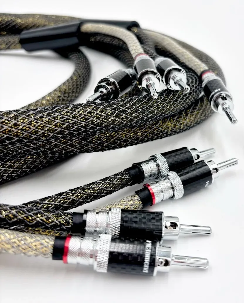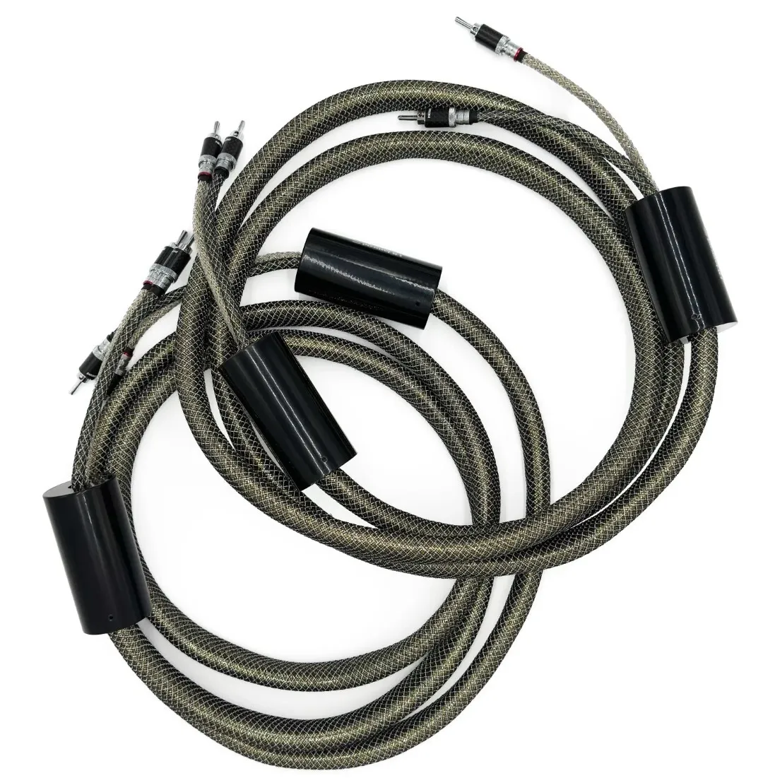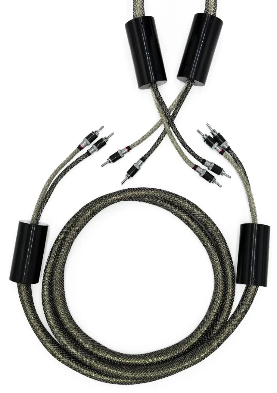 Referencyjny przewód głośnikowy zbudowany w technologii UP‐ 4VRC, wykorzystującej ultraczystą monokrystaliczną miedź (Ultra Pure Single Crystal Copper© – UP‐SCC 4VRC), wzbogaconą grafitem, co pozwala osiągnąć maksymalną redukcję zakłóceń i strat sygnału w stosunku do rozwiązań serii Bronze 4VRC©. Skrętna geometria wewnętrzna oparta na aż 16 żyłach o przekroju 2,5 mm² każda zapewnia niespotykaną gęstość przewodzenia i precyzję dźwięku. Przewód zakończony jest autorskimi złączami bananowymi pokrywanymi rodem, osadzonymi w karbonowych obudowach obrabianych w technologii NFC; opcjonalnie dostępne są również masywne widełki pokrywane rodem. Zewnętrzna średnica wynosi imponujące 280 mm, maksymalna pojemność to 40 pF/km, a opór przewodnika 7 Ω/km. To konstrukcja dla najbardziej wymagających audiofilów.