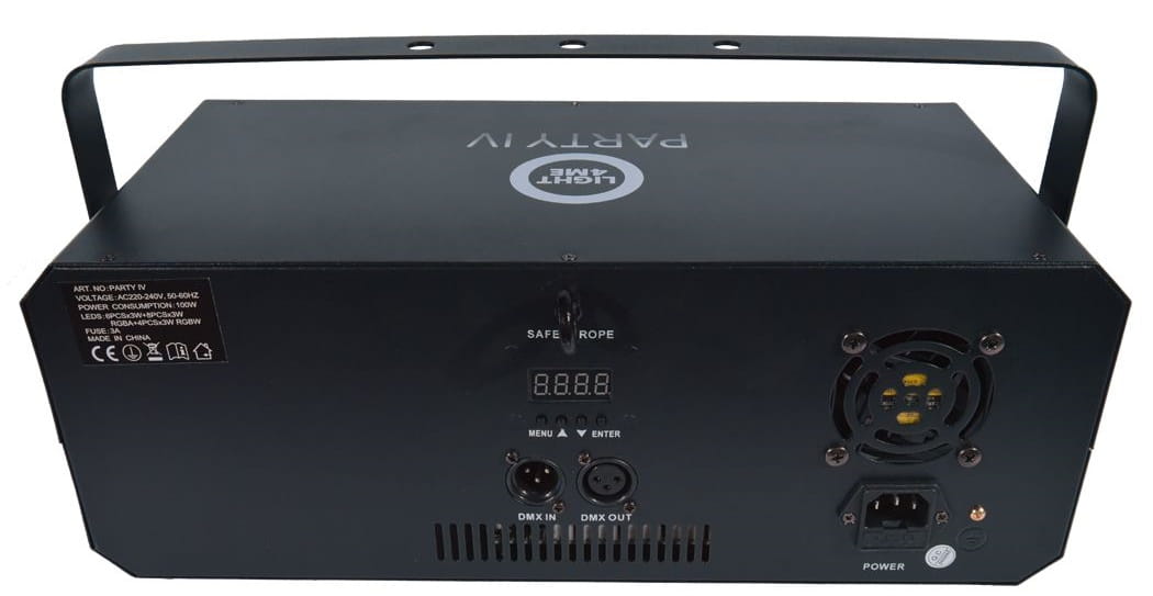 Na tyle obudowy znajduje się gniazdo zasilania, wejście i wyjście DMX oraz panel sterowania w postaci wyświetlacza LED oraz czterech przycisków.