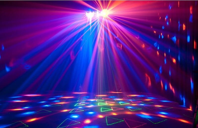 - sprzęt łączy w sobie funkcję kuli dyskotekowej, wash PAR, derby oraz efekty laserowe