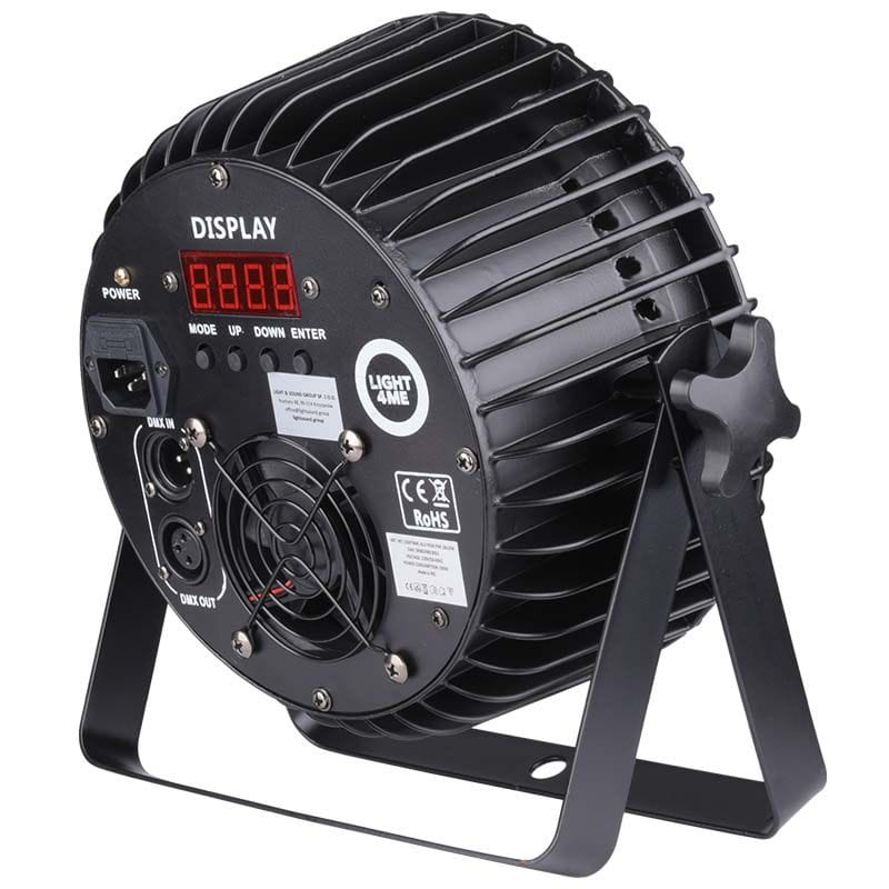 Reflektor Light4Me Alu Hexa PAR 18x10W to wysoka jakość wszystkich podzespołów zamknięta w solidnej aluminiowej obudowie. Oświetlacz wyposażony został w uchwyty montażowe, dzięki którym LED PAR może pracować w pozycji stojącej lub wiszącej. Z tyłu znajduje się złącze zasilania, 3-stykowe wejście i wyjście DMX oraz panel sterowania złożony z cyfrowego wyświetlacza i 4 przycisków. Za ich pomocą możemy poruszać się i wprowadzać zmiany w parametrach menu, ręcznie ustawić statyczny kolor świecenia lub wybrać jeden z 4 interesujących nas trybów pracy: