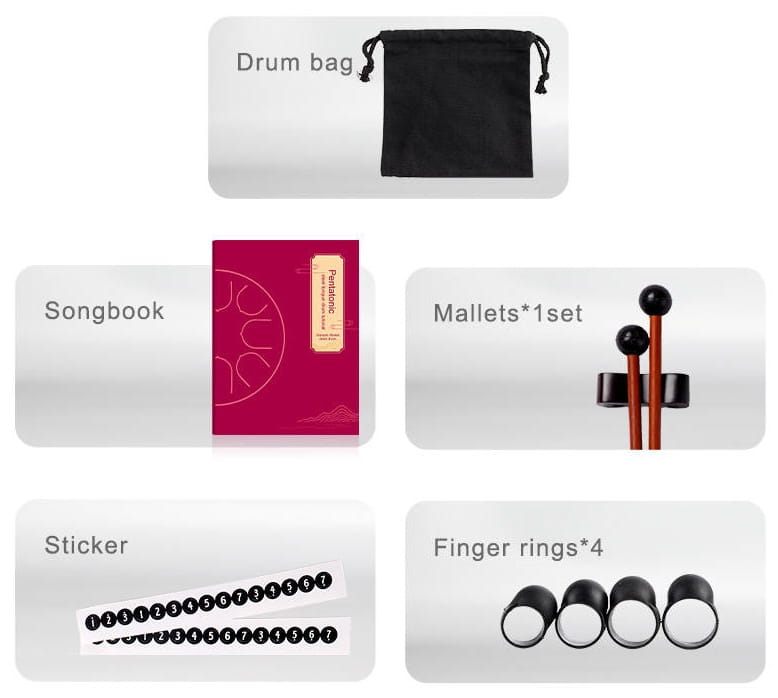 | W zestawie | 1 x Tongue Drum 1 x Torba transportowa 1 x Zestaw pałeczek 4 x Nakładki na palce 1 x Naklejka skali 1 x Samouczek |