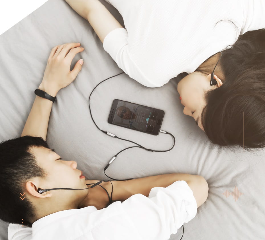 Słuchaj muzyki swoimi najbliższymi, korzystając z dwóch zestawów słuchawkowych lub jednego zestawu słuchawkowego i jednego głośnika z kablem AUX.