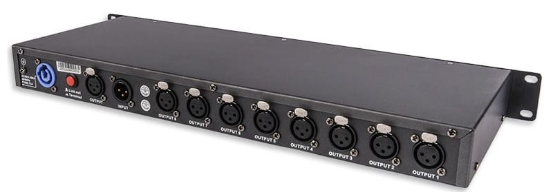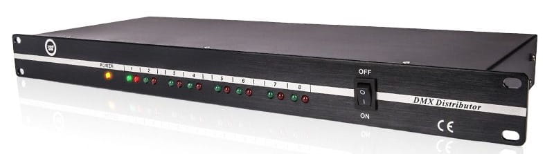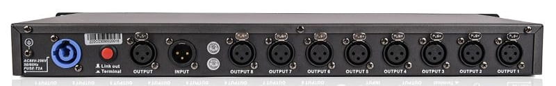 - profesjonalny, 8-kanałowy rozdzielacz sygnału DMX wyposażony w 3-pinowe wejście i wyjście DMX, przełącznik Link out/Terminal eliminujący błędy sygnału na długich liniach, oraz 8 dodatkowych wyjść DMX do podłączenia oświetlenia estradowego, efektów scenicznych, wytwornic dymu, wyrzutni iskier, konfetti oraz innych urządzeń pracujących w trybie DMX