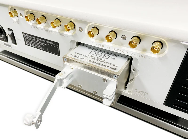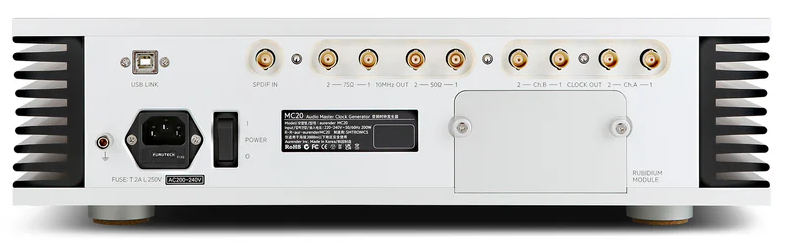 Sercem MC20 jest moduł rubidowy, który generuje sygnał odniesienia zegara głównego o częstotliwości 10 MHz. Zastosowano zegar rubidowy ze względu na jego wyjątkową dokładność i stabilność zarówno w długim, jak i krótkim okresie, co zapewnia bardzo niski poziom jittera. Dodatkowo MC20 zawiera dwa dyskretne moduły zegara OCXO do generowania częstotliwości 44,1 kHz i 48 kHz. MC20 będzie niezależnie i jednocześnie zasilał cztery wyjścia zegara głównego 10 MHz i cztery wyjścia zegara Word Clock (2 przy 44,1 kHz i 2 przy 48 kHz), zapewniając niespotykaną wszechstronność z szeroką gamą sprzętu Aurender i innych producentów.