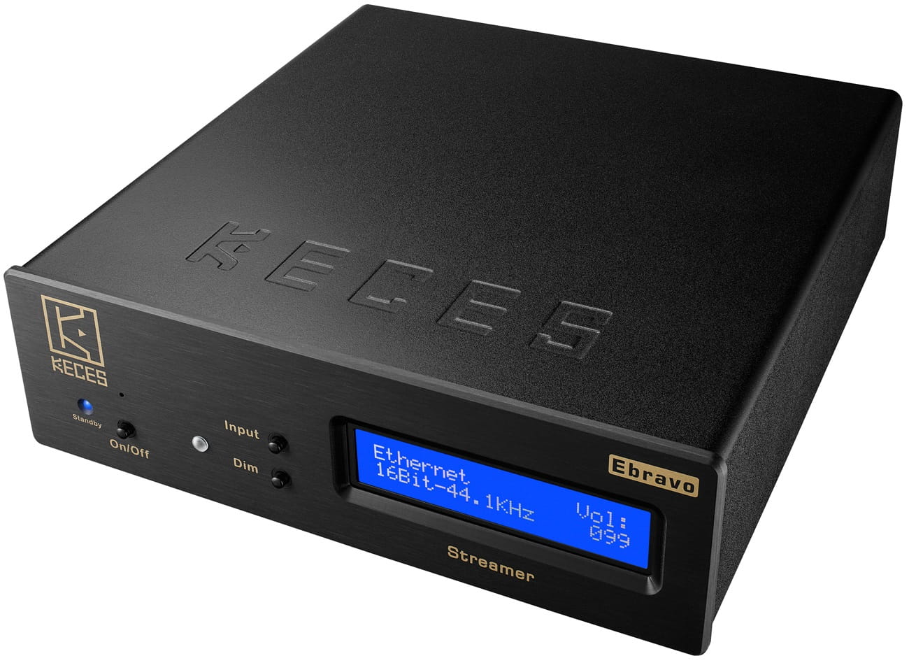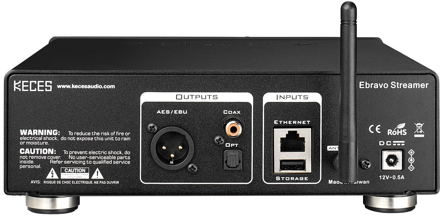Nowy streamer KECES Ebravo jest wyposażony we wszystkie istotne interfejsy cyfrowe, co pozwala mu działać jako transport strumieniowy z różnymi przetwornikami C/A w najbardziej optymalny sposób. Oprócz standardowych interfejsów optycznego i koncentrycznego S/PDIF, streamer KECES Ebravo oferuje również złącze AES/EBU. Na przednim panelu urządzenia umieszczony jest wyświetlacz, który, choć nie obsługuje grafiki, prezentuje informacje w sposób klarowny i zwięzły, wyświetlając jedynie tekst. Dodatkowo, znajdują się tam trzy przyciski.