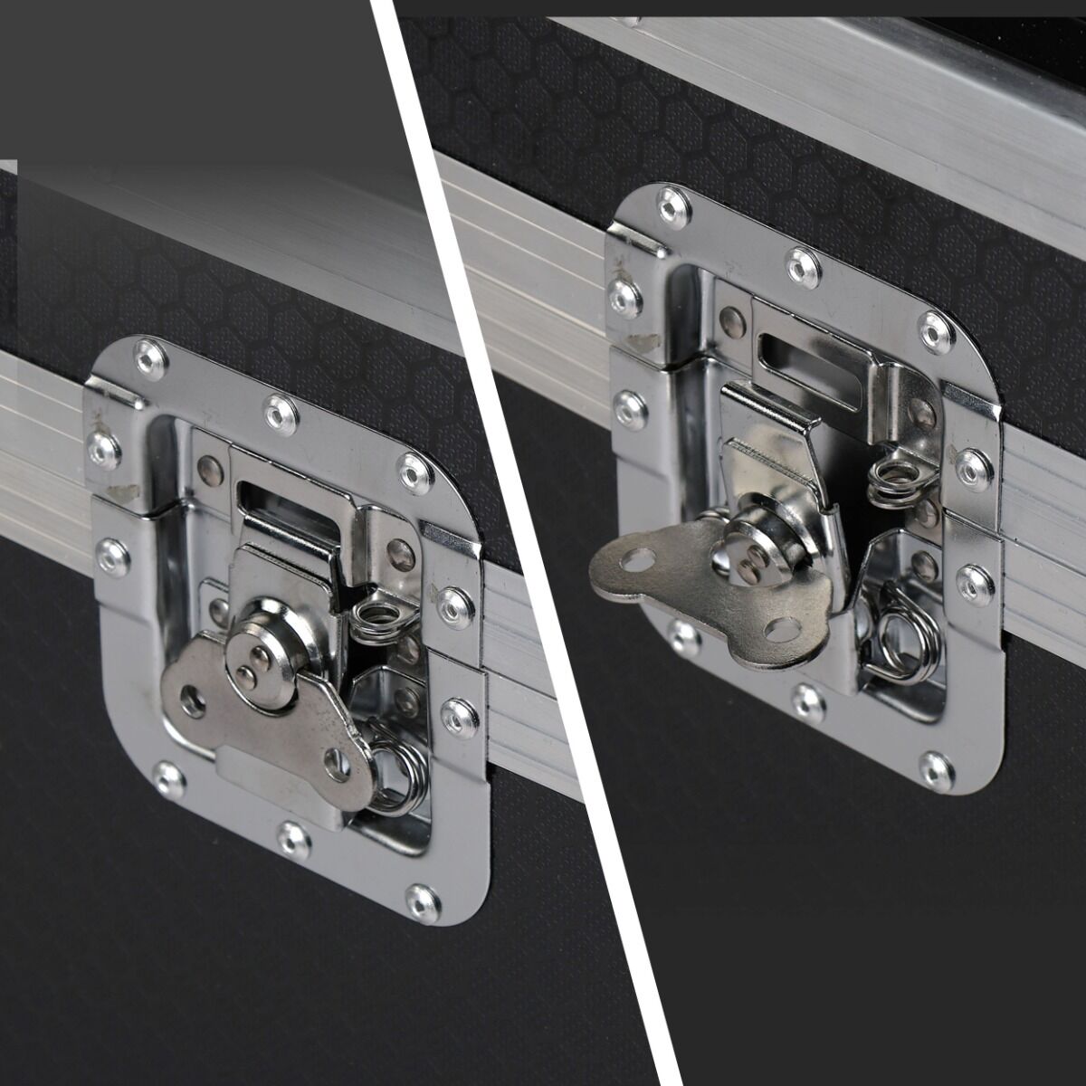 Zamki motylkowe gwarantują pewne i szybkie zamykanie ✴️ Narożne osłony kulowe dodatkowo zabezpieczają skrzynię przed uszkodzeniami podczas częstego załadunku i rozładunku ✨ Czarno-srebrny design doskonale komponuje się z innym sprzętem scenicznym, podkreślając profesjonalny charakter Twojej realizacji.