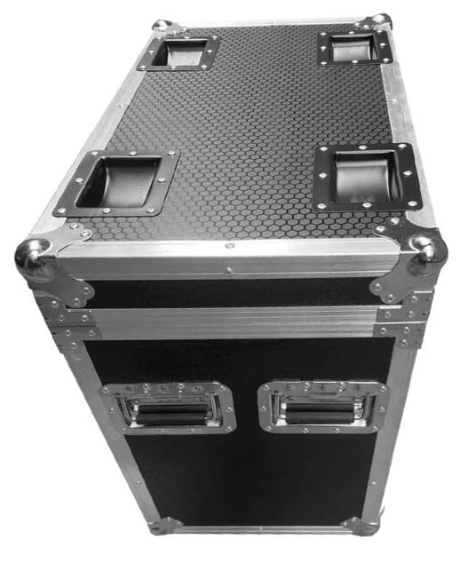 Evolights Lumen X Case 2in1 to ✅ profesjonalna i bardzo solidnie wykonana skrzynia transportowa na 2 reflektory estradowe Lumen X lub inne urządzenia o podobnych do tych reflektorów wymiarach. Case został wykonany z grubej, 7-milimetrowej sklejki pomalowanej specjalną, wodoodporną farbą. Jego krawędzie wzmocnione zostały aluminiowymi profilami. Na narożnikach znajdują się kulowe, chromowane osłony dodatkowo zabezpieczające konstrukcję oraz chroniące samo otoczenie skrzyni, dzięki wyeliminowaniu ostrych krawędzi.